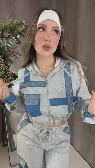 Step up your street-style game with this stunning two-piece cargo denim set featuring dazzling rhinestone accents.